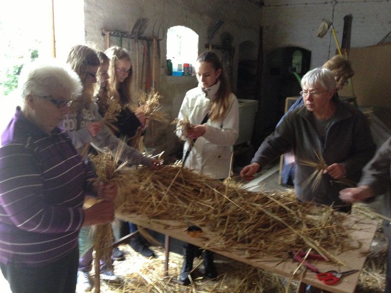Am 23. September trafen sich die Frauen vom Frauenkreis der evangelischen Kirchengemeinde unter Leitung von Rita Geermann und einige Konfirmandinnen sowie Pastorin Petra Wesemann und ihre jüngste Tochter in der Scheune von Marlene Hansen, um eine neue Erntekrone für die Marienkirche zu binden. Aus Hafer, Weizen-, Roggen- und Gerstenähren banden die fleißigen Helferinnen kleine Sträußchen. Diese wurden an Karin Ahlers und Irma Helms weitergereicht, welches die einzelnen Sträußchen mit Draht um das Metallgestell der Erntekrone festbanden. Bei der Arbeit gab es einen regen Austausch zwischen Alt und Jung. Welcher Halm zu welcher Getreidesorte gehört, wurde von erfahrenen Landwirtsfrauen erklärt. Und Karin Ahlers erzählte stolz: „Dies ist schon das 2. Mal, dass ich eine Erntekrone binde, und das, obwohl ich doch eigentlich aus der Stadt bin.“ Die alte Erntekrone war erst 6 Jahre alt. Aber im letzten Jahr wurde festgestellt, dass sich der Kornkäfer über das Getreide hergemacht hatte. Darum beschloss der Frauenkreis, in diesem Jahr gemeinsam eine neue Krone zu binden. Die meiste Erfahrung damit hatte Irma Helms. „Meine erste Erntekrone habe ich mit 16 Jahren gebunden,“ erzählt sie, „damals war ich in der Landjugend.“ Und eigentlich ist es für die inzwischen 77 jährige Irma Helms auch ein Jubiläum, denn diese Krone ist die 10. Erntekrone, die sie bindet.