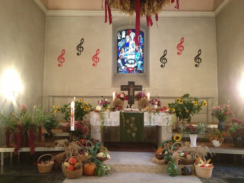 4. Mit anderen teilen, denn das gefällt Gott und macht unsere Gemeinde attraktiv und einladend für andere. Am Dienstag, 7. Oktober um 11 Uhr feierte der evangelische Kindergarten eine Andacht zum Erntedankfest. Es gab ein Anspiel über Obst, das sich jeweils für das tollste und beste Obst hielt und schließlich erfuhr, dass es als bunter Obstsalat am besten schmeckte. Ähnlich ist es bei Menschen: Alle sind verschieden, Gott hat uns unterschiedlich gemacht und unterschiedlich begabt, aber zusammen geben wir eine tolle, vielseitige Gemeinschaft ab. Nach der Andacht hatten die Kinder noch die Gelegenheit, sich den wunderbar geschmückten Altar anzuschauen und so manches Obst und Gemüse zu bestimmen, dass sie sonst im Alltag nicht unbedingt zu sehen bekommen. An dieser Stelle allen, die die Gottesdienste vorbereitet und mitgestaltet haben sowie den fleißigen Kirchen-Dekorateurinnen und -Dekorateuren ein ganz herzliches Dankeschön!